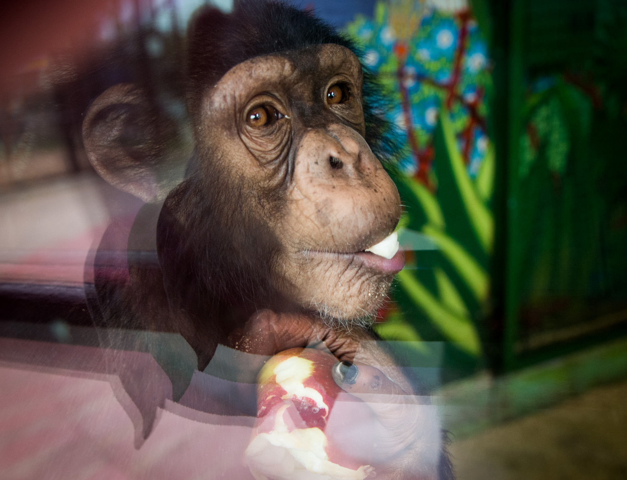 Чего не отнять у шимпанзе – способности есть ваши яблоки, задумчиво глядя вдаль. Иногда даже непонятно – кто кого изучает?