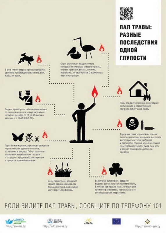 Центр экологических решений предлагает жечь не в природе, а в творчестве: запущен конкурс «Творческий запал». Ключевой в нём как раз и является тема предотвращения весенних палов травы и мусора. Лучше направить свою энергию и креатив на то, чтобы неординарно рассказать другим о проблеме. В рамках информационной кампании для населения работает горячая линия Общественного информационного центра по вопросам химической безопасности и отходам, телефон +37517 237 40 70.