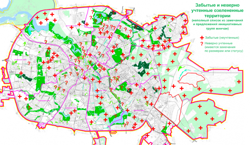 Так, в Схемах не учтена часть территорий вблизи жилых домов, вдоль улиц и перекрестков, а также городские леса и многие озелененные территории водно-зеленого диаметра Минска, резервные озелененные территории.