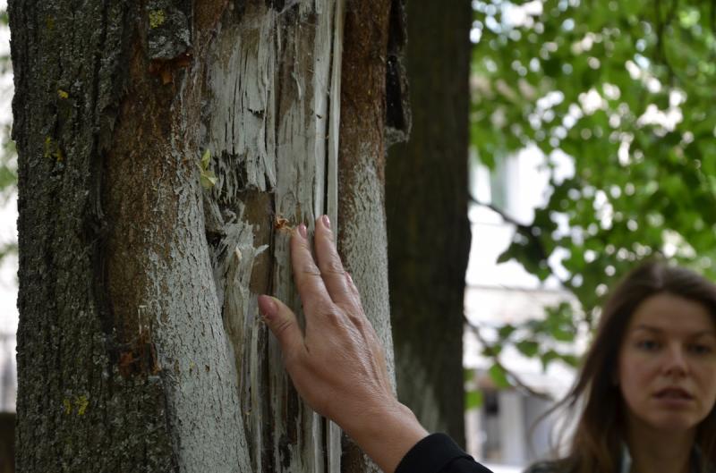 На наступным дрэве эксперты таксама не знайшлі падстаў выдаляць яго ў тэрміновым парадку. Адзінай рэкамендацыяй, якую Васіль Савельеў, спецыяліст-батанік даваў яшчэ год таму, - зафарбаваць усе бачныя пашкоджанні і правесці санітарную абрэзку. Але далей завязваецца невялікая спрэчка.