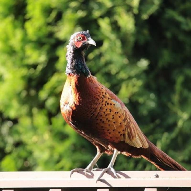 Погулял я там полчаса в ожидании и пошёл дальше. Смотрю, метров через 150 сидит тот же фазан на заборе. Пока он меня не заметил, пробрался я сквозь кусты и вышел прямо на него.