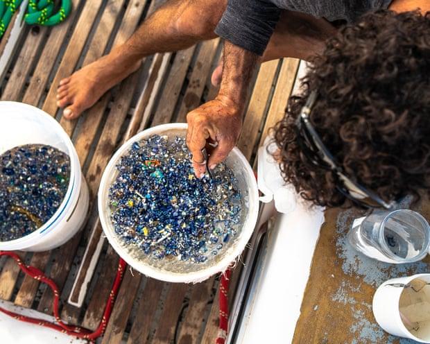Команда же занимается тем, что с помощью сетей собирает в воде образцы пластика (часто несколько тысяч единиц в день), которые раскладываются и скрупулёзно подсчитываются. По оценкам группы, за последние три недели она собрала более 17 000 кусков микропластика и нашли более 1200 больших кусков плавающего пластикового мусора.