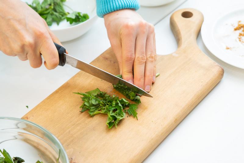 Нарезаем мелко яйца, сныть и крапиву.