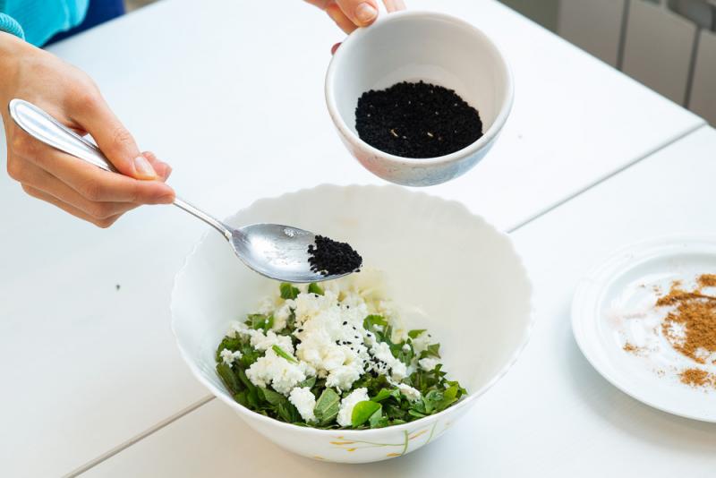 Добавляем немного черного тмина, соль и приправу.