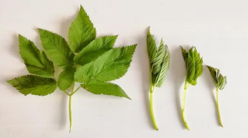 Росток сныти имеет характерную форму - от основного стебля отходят три ответвления (самый крупный посередине и два более мелких по бокам), на каждом из них по три листочка.