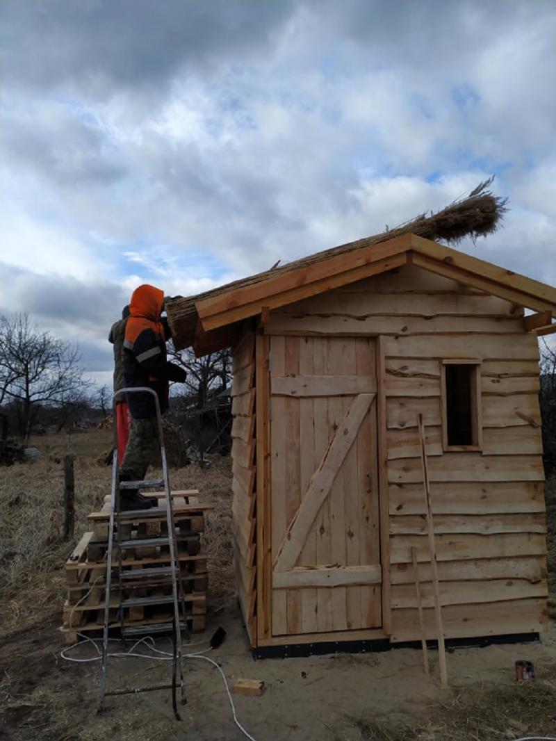 Сверху туалет покрыт крышей из рогоза. Этой весной мы сами его заготавливали, но это ужаснейший труд, больше сооружать что-либо из рогоза вряд ли решимся.