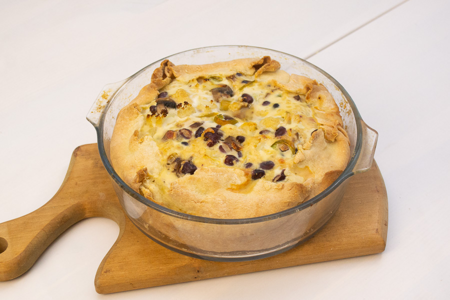 Перекладываем его в форму для запекания, заполняем начинкой, формируем бортики пирога.