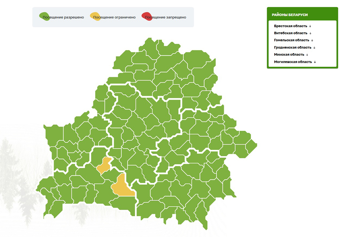 Леса нельзя посещать в Каменецком, Брестском, Малоритском, Барановичском, Ивацевичском, Березовском, Ляховичском, Ганцевичском, Лунинецком и Столинском районах.