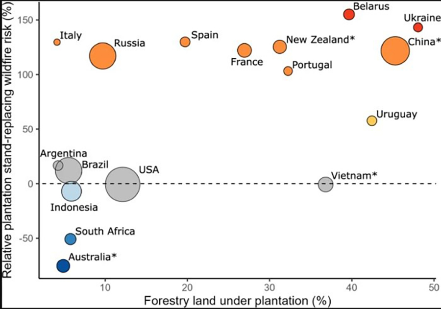 Навукоўцы выявілі, што Беларусь уваходзіць у топ краін, дзе рызыка пажараў на штучных пасадках нашмат вышэйшая, чым рызыка пажараў у натуральных лясах (на графіку).