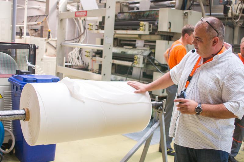 Сейчас на предприятии производят фасовочные и мусорные пакеты, пакеты-майки. Техпроцесс начинается с переработки сырья: через формирующую щель под давлением выходит рукав, воздух его охлаждает. Так получается плёнка.
