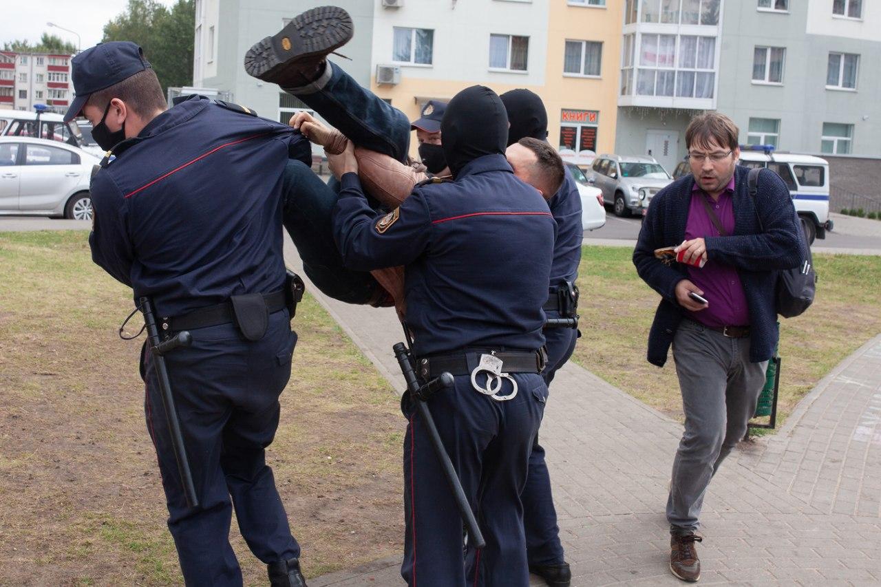 Тут его перебивают стоящие рядом люди и объясняют: речь идет о мужчинах в форме с надписями «милиция», которые никак не представились, несмотря на просьбы.