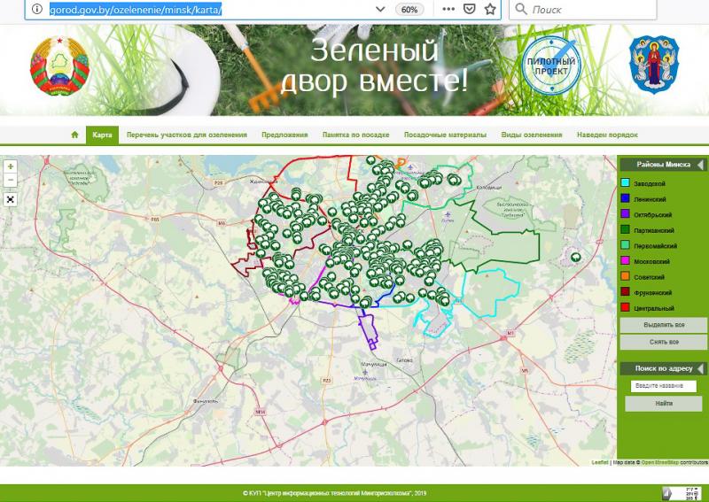 Раздела «О проекте» на сайте нет, но зато внизу страницы стоит копирайт КУП «Центр информационных технологий Мингорисполкома», 2019 год. Уточняется, что работы идут в рамках месячника по благоустройству и озеленению дворов, мест отдыха, парков и других общественных зон города (то есть до конца апреля).