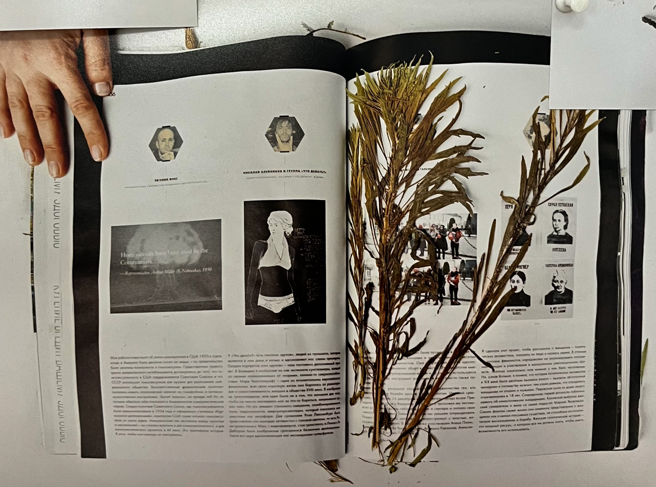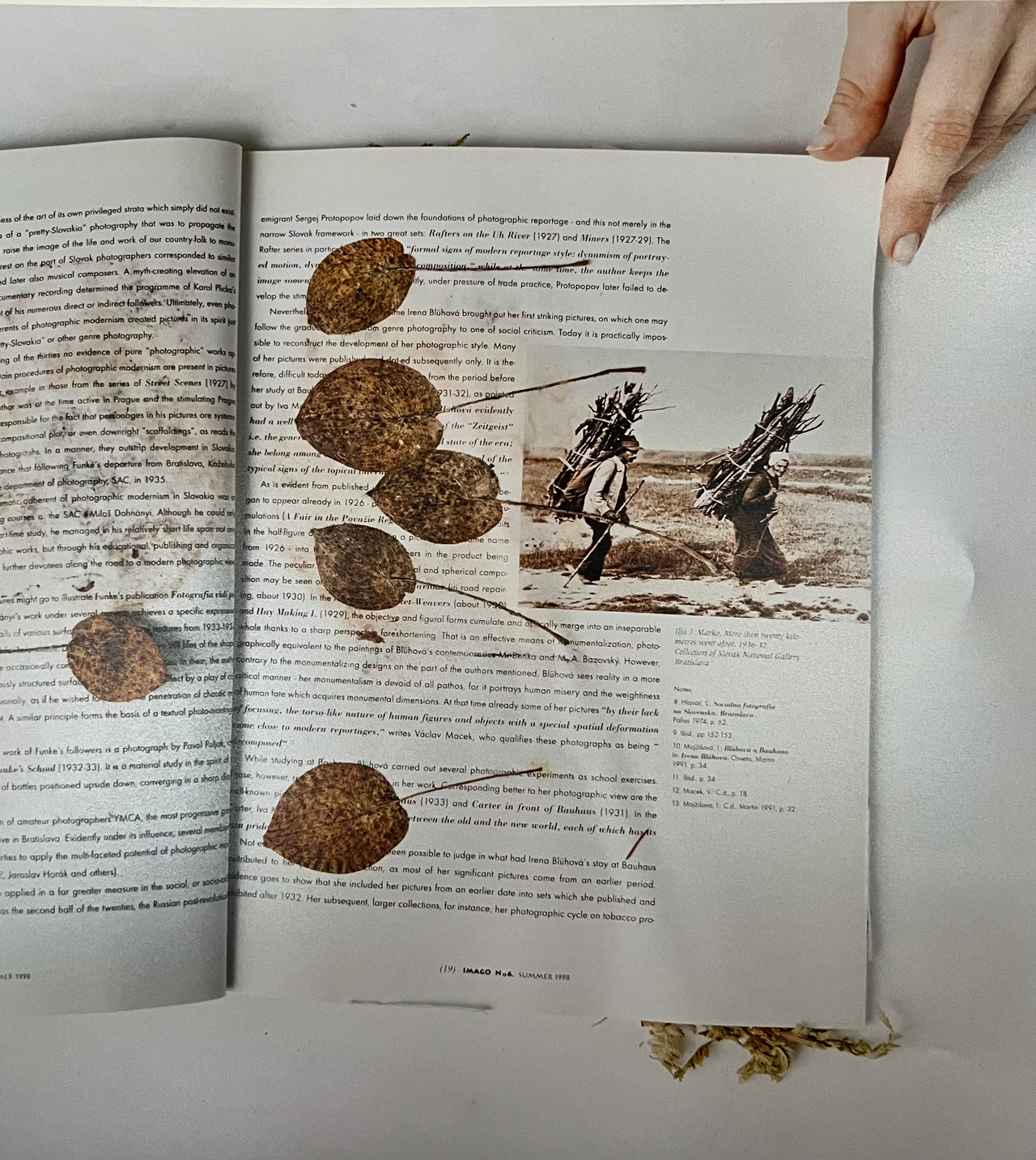 «Калі ў Латвіі і Літве я сама збірала зёлкі разам з батанікам, то ў Беларусь я не магла прыехаць. Я папрасіла сваіх сяброў-фатографаў з’ездзіць на чатыры выбраныя месцы і сабраць для мяне батанічны атлас, дала ўвесь тэхнічны райдэр, што трэба рабіць. Яны ўсё зрабілі і засушылі. Каб даслаць мне гэтыя зёлкі, спатрэбілася нейкая макулатура, лісты. Сябры выкарысталі старыя часопісы пра фатаграфіі, і зёлкі прыйшлі ў гэтых часопісах. Калі я пачала іх адкрываць, у мяне проста мурашы пайшлі па целе, бо я зразумела, што праект размаўляе са мной: адкрываю адзін разварот, а там старонкі часопіса з загалоўкам “Мы і Яны”. Адкрываю іншы, а там дзяўчынкі ў шлюбных сукенках. Далей фатаграфія мёртванароджанага дзіцяці з рудымі валасамі, і гэтыя фатаграфіі называюцца “Спячая прынцэса Украіны”».
