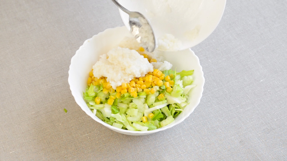 За это время рис уже должен свариться. Дождемся, пока он остынет, затем перекладываем к остальным ингредиентам.