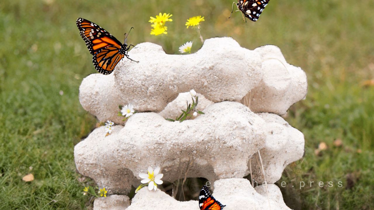 Это не просто скульптура — это экосистема. EggNest выполнен из переработанной яичной скорлупы и почвы: этот природный композит не только разлагается без следа, но и создает идеальную текстуру для того, чтобы бабочки могли спокойно приземляться и укрываться. Грубоватая поверхность помогает удерживаться, а изогнутая форма гнезда регулирует микроклимат внутри, защищая от жары, холода и хищников.