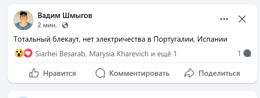 О том, что в Португалии и Испании нет электричества, написал в своем аккаунте в Фейсбук и беларусский айтишник Вадим Шмыгов.