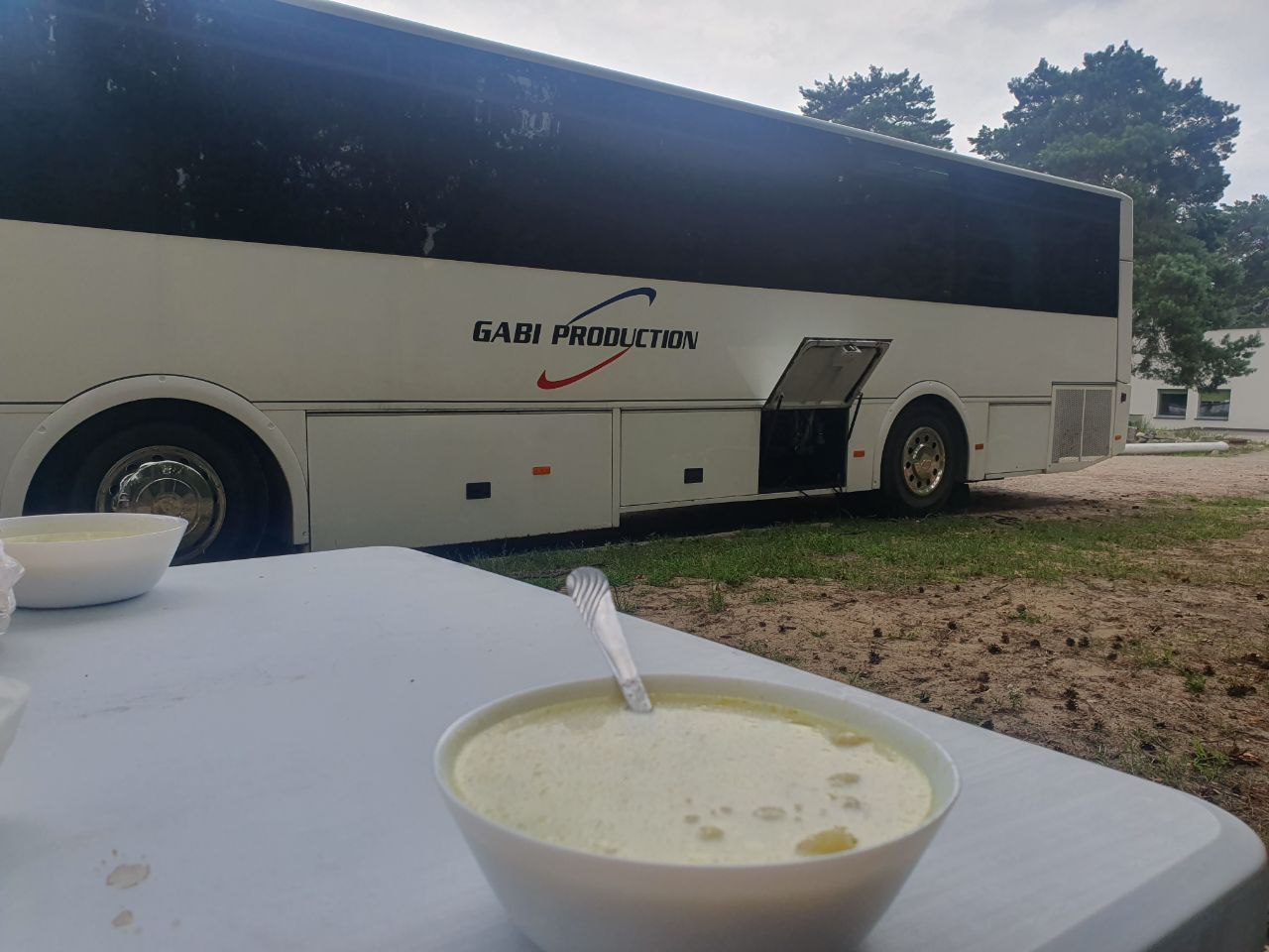 Баробус — мобильная кухня — не приспособлен для мытья посуды, нужно её собрать и отвезти после на мойку, что не всегда удобно. Поэтому — одноразовая посуда, бутерброды в пакетиках.