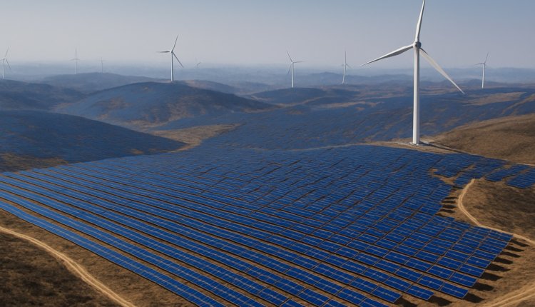 Солнечные панели и ветряные турбины, простирающиеся до горизонта. В 2024 году Китай построил столько "зелёных" электростанций, что их общая мощность превысила объемы, введенные всеми остальными странами мира вместе взятыми.