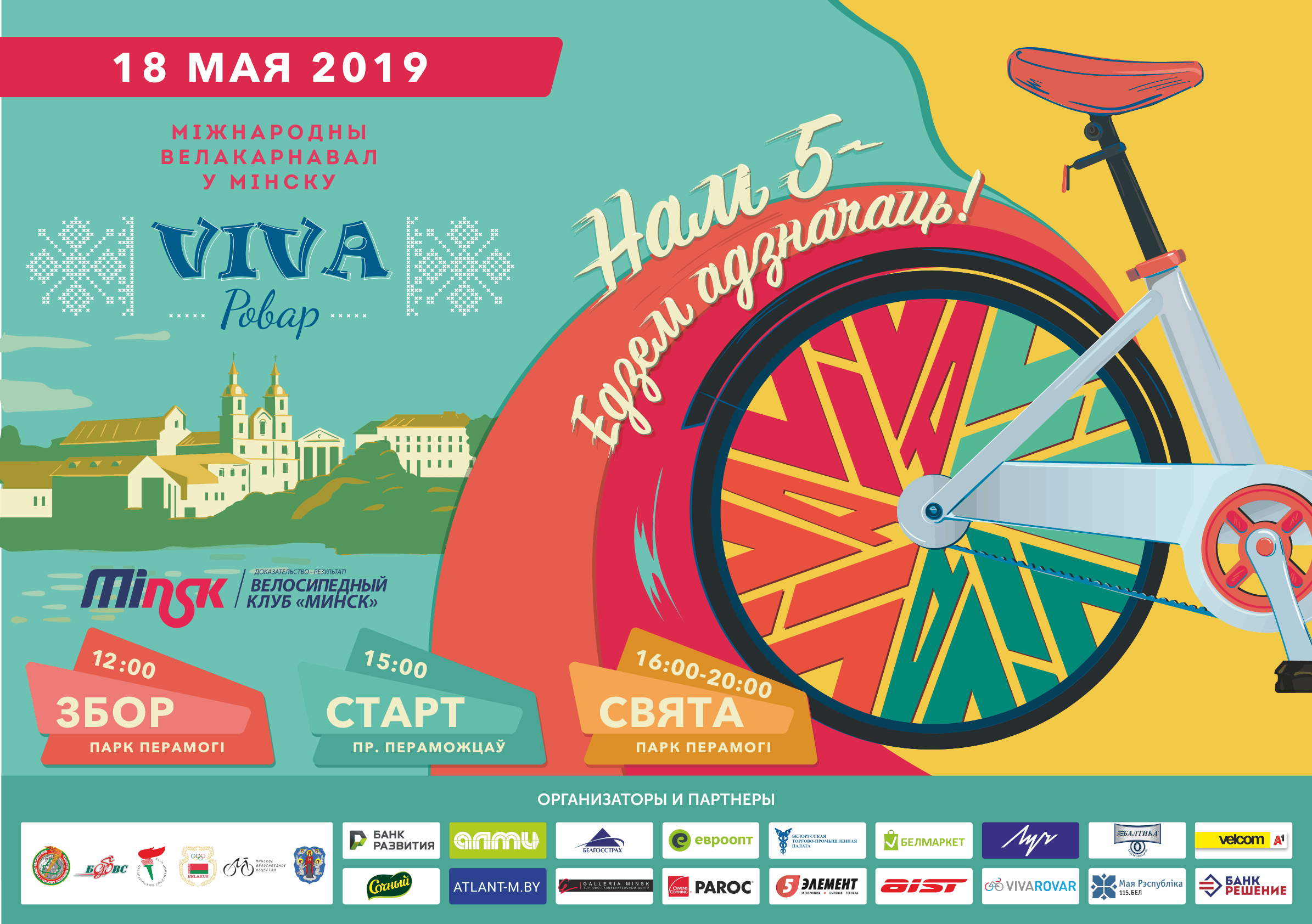 15:00-16:00 — масштабный карнавальный велопарад, старт от стелы «Минск — город-герой», проезда по пр-ту Победителей с разворотом в районе «Минск-арены»