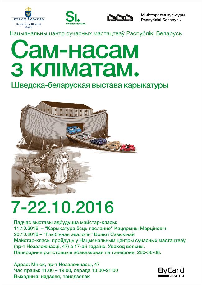 Сёлета амбіцыёзны праект Шведскага інстытута фінальна рэалізаваўся ў буйной публікацыі – альбоме, які з’яднаў мастацкія і дыскурсіўныя разважанні прафесіяналаў розных краінаў свету. У альбом патрапілі таксама і працы 6-ці беларускіх мастакоў: Рамана Сустава, Кацярыны Марціновіч, Алега Карповіча, Вольгі Сазыкінай, Сяргея Волкава і Антаніны Слабодчыкавай. У рамках міжнароднага праекта «Сам-насам з кліматам» і з нагоды выпуску альбома ў Нацыянальным цэнтры сучасных мастацтваў Рэспублікі Беларусь пройдзе аднайменная шведска-беларуская выстава. Выстава складаецца з дзвюх частак, уключае творы мясцовых мастакоў і шведскіх карыкатурыстаў і ўяўляе сабой візуальны шэраг экспазіцыі, якая даступным спосабам уздымае пытанні змены клімату перад гледачом.