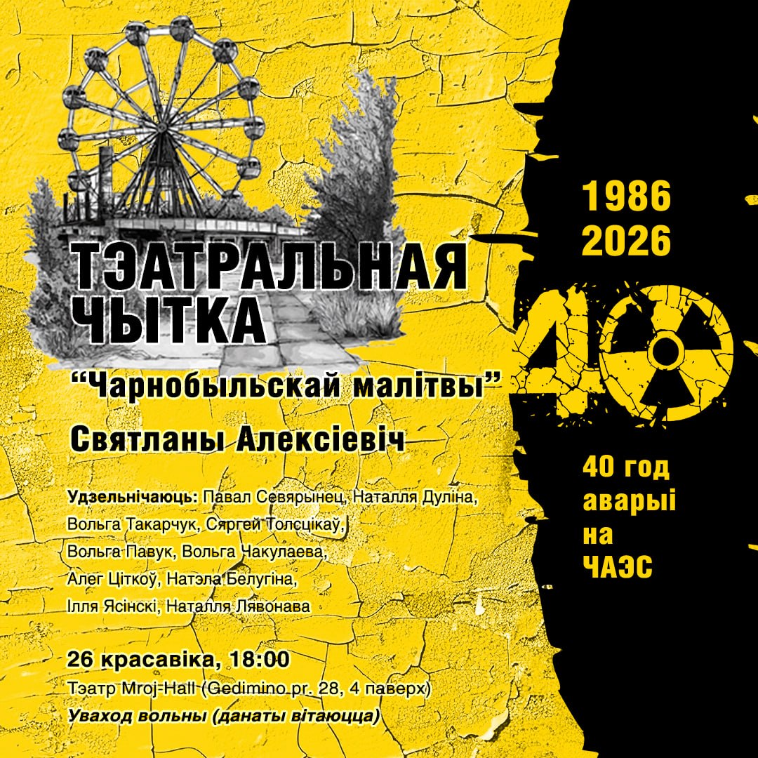 Чытка ўрыўкаў кнігі «Чарнобыльская малітва» Святланы Алексіевіч на сцэне віленскага тэатра Mroj-Hall з удзелам беларускіх грамадскіх дзеячаў_ак, актывістаў_ак, акцёраў_ак, былых палітвязняў_ынак.
