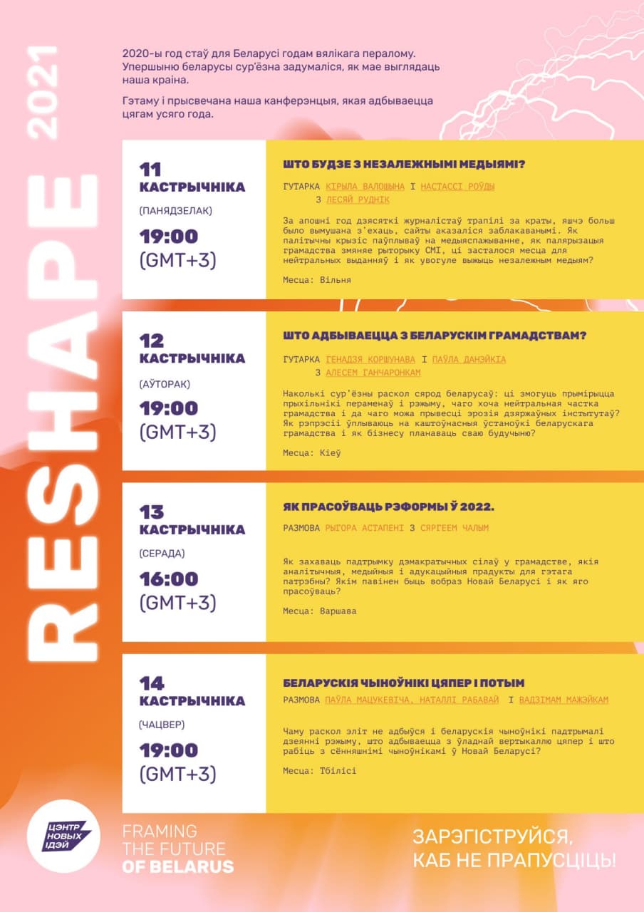 Мы рады абвесціць трэці блок нашай канферэнцыі Reshape! Нашыя спікеры і мадэратары сустрэнуцца ў Вільні, Варшаве, Кіеве і Тбілісі і абмяркуюць, што будзе адбывацца з беларускім грамадствам, незалежнымі СМІ і якія рэформы будуць патрэбны ў Новай Беларусі.